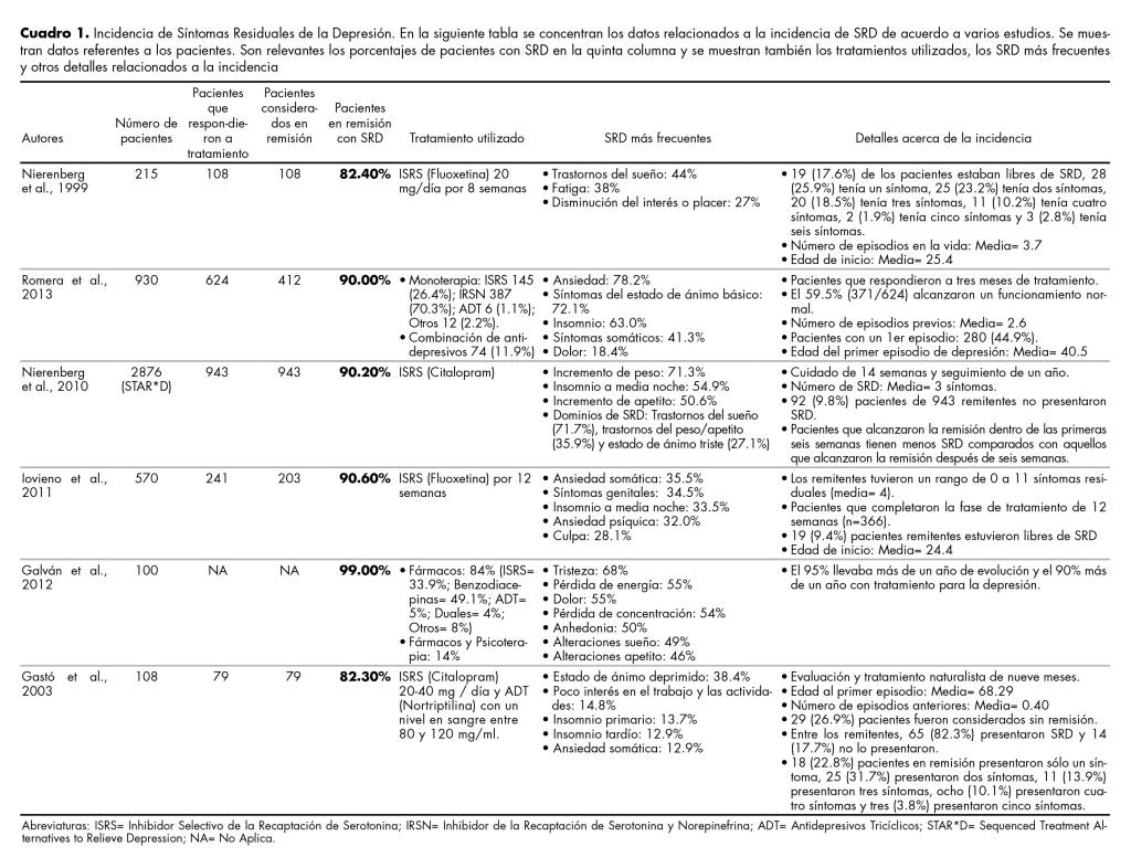 Varios autores reportan altas tasas de SRD posteriores al tratamiento antidepresivo. En un estudio de 215 pacientes tratados con fluoxetina (20 mg/día, por ocho semanas), 108 respondieron al tratamiento (50.2%), de los cuales sólo el 17.6% no registró SRD, el 25.9% registró un SRD, y el 56.5% registró dos o más SRD.23 En otra publicación, de los 624 pacientes que respondieron al tratamiento antidepresivo durante tres meses, sólo 412 obtuvieron la remisión, de éstos, el 90% registró por lo menos un SRD,7 porcentaje similar reportado por Nierenberg e Iovieno.24,25 Otro estudio con 100 pacientes que recibieron tratamiento farmacológico y/o psicoterapéutico durante tres meses, reportó que el 99% tenía presencia de SRD, de los cuales el 22% presentaba cuatro síntomas.20 En un último trabajo a mencionar, de 108 pacientes con TDM evaluados y tratados por nueve meses, 79 (73.1%) fueron considerados remitentes, sin embargo, de ellos, el 82.3% presentaron SRD.26 El cuadro 1 muestra otros datos que confirman el alcance de los SRD. La alta incidencia de SRD en la clínica ratifica la consideración de abordar nuevas investigaciones sobre su manejo.