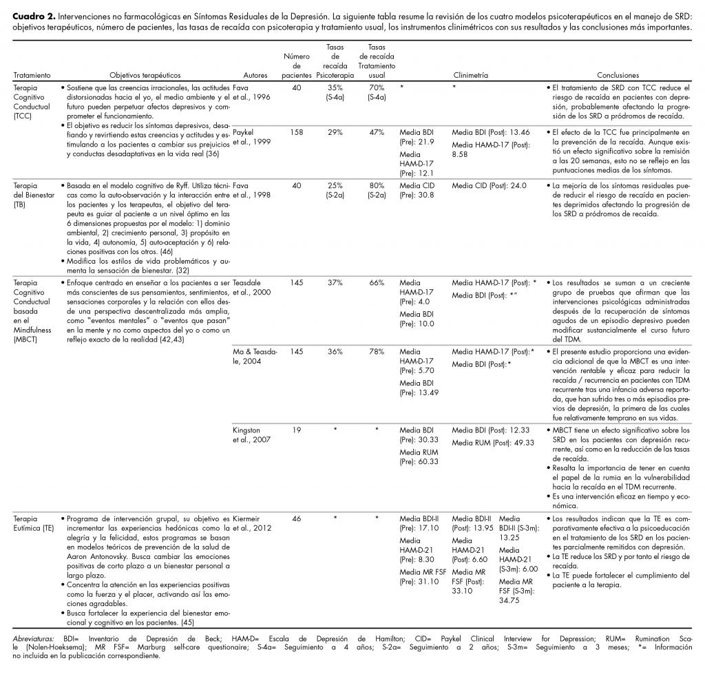 Los Síntomas residuales de la depresión (SRD) son un hecho frecuente en la clínica psiquiátrica, se presentan posterior a la remisión y subsisten a pesar de una farmacoterapia exitosa. Su desatención es un riesgo latente debido a la alta probabilidad de recaída y discapacidad. Los antidepresivos a largo plazo son una solución parcial, ya que los efectos secundarios son razón suficiente para considerar el planteamiento de nuevas estrategias. El objetivo de la presente revisión es conocer y analizar las opciones de tratamiento no farmacológico para el manejo de los SRD. Se han encontrado cuatro tratamientos de tipo psicoterapéutico, los cuales se reportan como una alternativa viable con buenos resultados. La búsqueda de bibliografía se hizo por medio de los buscadores PUBMED, MEDLINE y COCHRANE BVS, utilizando las palabras clave (síntomas residuales, remisión parcial, tratamiento farmacológico, no farmacológico y psicoterapéutico).