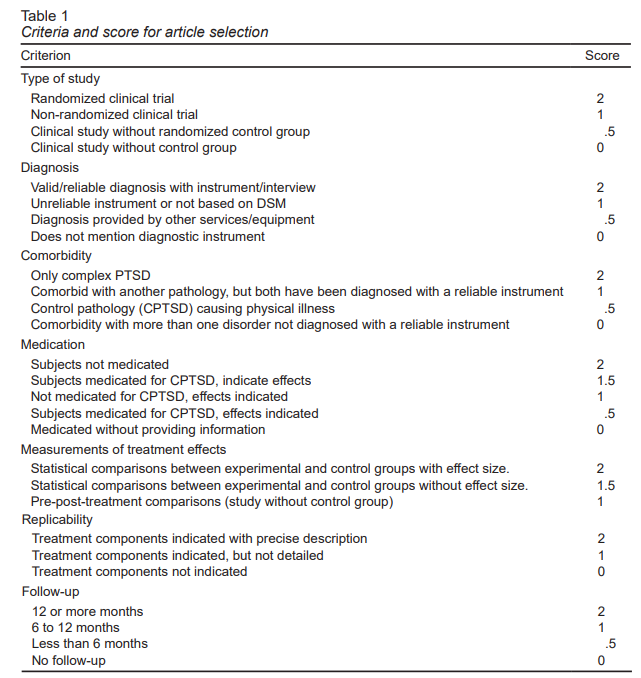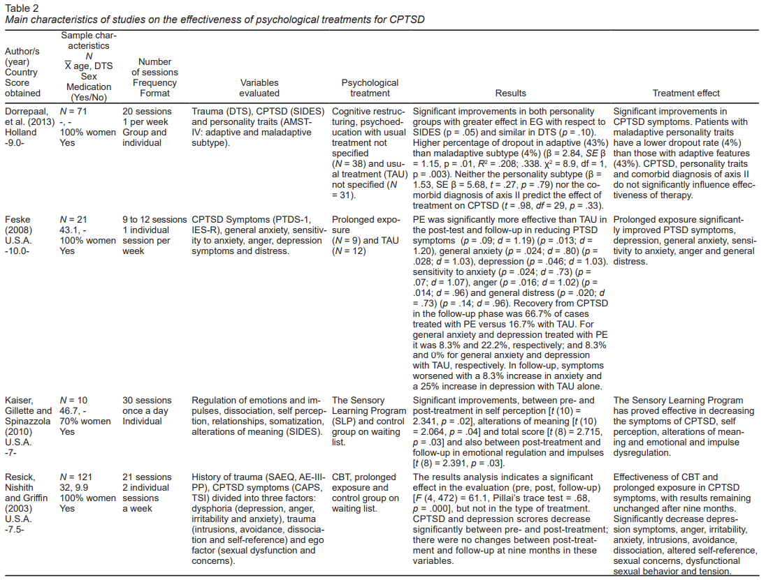 Lastly, the following information was extracted from each of the selected articles: authors, characteristics of the sample (sex, age, size), variables evaluated, and evaluation instruments used, name and features of the psychological treatment used, number, frequency and duration of sessions, format (individual or group), and duration of treatment and follow-up, statistical analysis of the data collected, and treatment effects (taking into account the variables evaluated and CPTSD symptoms).