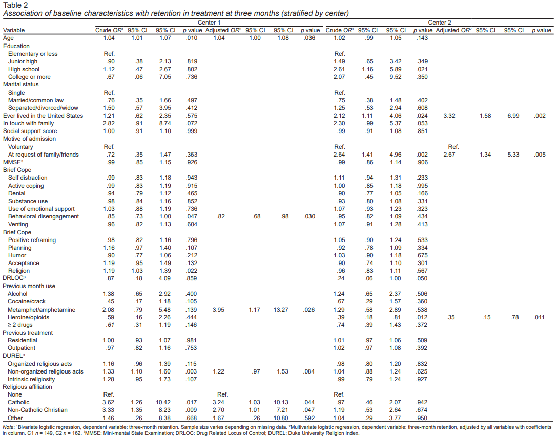 In Table 2 we show the associations of the independent variables with retention, stratified by center. In C1, older age was associated with higher odds of retention, while the Behavioral Disengagement copying style (e.g., “I gave up”) was associated with lower odds. There was a significant bivariate association between retention and the religion copying style (e.g., “I prayed or meditated”), but it disappeared after adjusting for other variables. Methamphetamine use was associated with higher odds of retention. Catholic and Non-Catholic Christian religious affiliation were also associated with retention. In C2, having lived in the United States and having been admitted at the request of family or friends were associated with higher odds of retention, while using heroin/opioids was associated with lower odds.