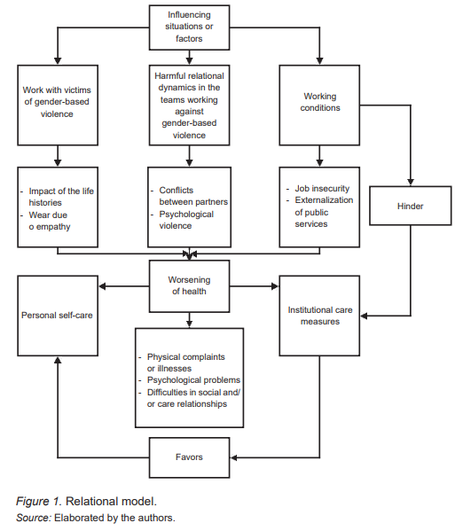 The study participants’ reports draw a scenario full of obstacles, deficiencies, and heavy professional burdens. The repercussions described entail severe consequences for health that, far from being solved, are mostly ignored or treated partially by the institutions where they perform their professional work. These difficulties derive from some situations in the social, economic, and relational context of work in care for victims of violence ( Figure 1 ).