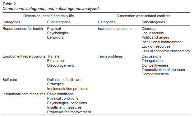 The participants expose some problems for the accomplishment of this self-care though. The main difficulties exposed are related to the condition of being a woman (refers to the burden of tasks and the assigned family care roles), the lack of time “self-care is what I have left when everyone goes to sleep...” and the lack of institutional response to the physical and psychological problems the workers report “I do not have to be well because I spend my salary on therapies” ( Table 4 , quotes L and O). The narrations of the interviewees indicate that there are deficits in the practice of this care.