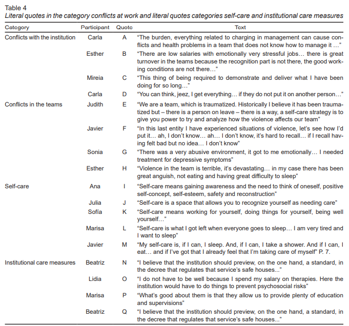 Among all the subcategories that emerged from the narratives analyzed, those that all the participants cited as strongly influencing the problem are detailed below: first, the job insecurity “there is no part about good working conditions...” or the lack of resources to carry out the work in optimal conditions “I get everything ... if they do not put it on another person...” ( Table 4 , quotes B and D). The main elements that make up these concepts are the practice of unpaid overtime, low salaries, temporary contracts and part-time contracts. On the latter, participants say they do not have enough time at work to provide adequate care to users or to meet the required commitments.