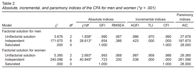 Considering the results shown on Table 2 , the CFA of the one-factor structure for the sample composed of men showed appropriate goodness of fit indices (GFI = .990 and RMSEA = .067). Likewise, the measures of incremental adjustment and parsimony were higher than the parameters of the independent model and were very like the parameters found with the saturated model. On the other hand, the goodness off it indices for the sample composed of women were also favorable (GFI = .993 and RMSEA = .068) and, as in the sample composed of men, the incremental adjustment and parsimony indices for the one-factor model were higher than those for the independent model, and were very similar to the parameters found with the saturated model. In both samples the absolute, incremental, and parsimony indices were adequate.