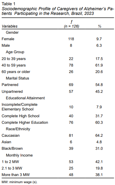 A total of 126 caregivers participated in the research, comprising 118 females and eight males, with ages ranging from 22 to 80 years (M = 51.36; SD = 10.90). The data in Table 1 reveal a predominance of caregivers who were in the 40 to 59 year age group (61.9%), partnered (54.8%), had completed higher education (60.3%), were Caucasian (64.2%), and earned a monthly income ranging from one to two minimum wages (42.1%).
