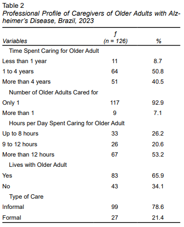 According to the results shown in Table 2, most caregivers reported having cared for only one older adult with AD (92.9%) for a period ranging from one to four years (50.8%) and for more than 12 hours per day (53.2%). Most of them also lived with the older adults (65.9%) and provided informal care (78.6%). The mean age of the older adults reported by caregivers was 81.48 (SD = 7.91) years.