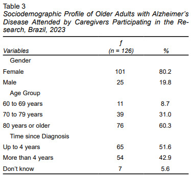 According to the caregivers (Table 3), most of the older adults with AD they cared for were female (80.2%), aged over 80 years (60.3%), and had been diagnosed with AD less than four years earlier (51.6%).