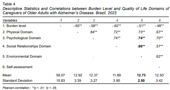 Table 4 shows that caregivers exhibited a slight burden overall (Md = 59.07; SD = 15.83). Regarding QoL, higher scores were observed in the physical domain (M = 12.92; SD = 3.39), followed by the environmental (M = 12.73; SD = 2.50), self-assessment (M = 12.50; SD = 3.42), psychological (M = 12.37; SD = 3.27), and social relationships domains (M = 11.89; SD = 3.90).