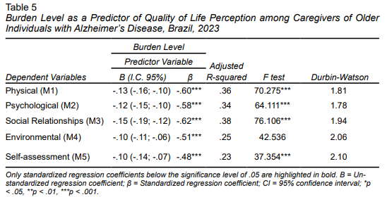 Results. The burden level explained a significant degree of caregivers’ perceived quality of life (p < .01), with a significant negative prediction across all quality of life domains (β = -.48 to -.62).