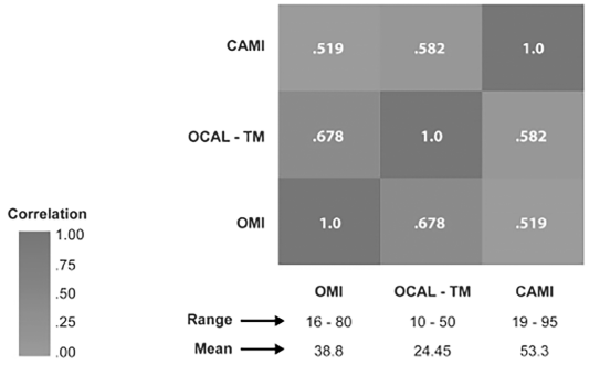 Graph 2 is a heat map based on Spearman’s test between the three instruments analyzed. Statistically significant correlations were observed between the three scales, with a significance level of p =< .000. Correlations between OCAL-TM and CAMI, and OCAL-TM and OMI was higher than the correlation between OMI and CAMI.