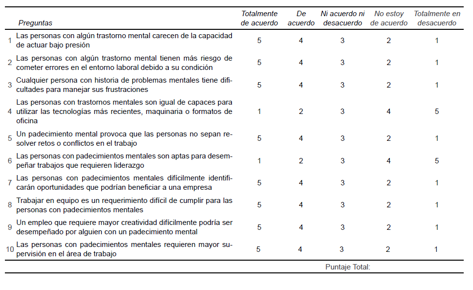 Lee cada uno de los siguientes enunciados y señala el grado en el que estás de acuerdo con cada afirmación en relación con las personas con trastornos mentales (TM) en el ámbito laboral. Indica tu respuesta seleccionando una de las opciones que vienen en el primer renglón: Totalmente de acuerdo, de acuerdo, ni acuerdo ni desacuerdo, no estoy de acuerdo y totalmente en desacuerdo.