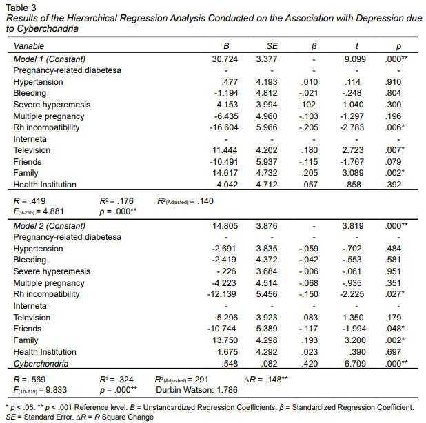 The data obtained in this study were analyzed using the SPSS 23 package program. Skewness and Kurtosis values were examined to determine whether the data follow a normal distribution. Descriptive statistics were analyzed using numbers, percentages, medians, means, and standard deviations. Pearson correlation analysis was conducted to examine the relationships between scales. While correlation findings align with the broader literature, they confirm that these associations are also found in high-risk pregnant women, a group with unique psychosocial vulnerabilities. These correlations were therefore reported not to demonstrate novelty, but to validate these well-established relationships within this specific population. Hierarchical regression analysis was performed to determine the predictive power of cyberchondria on depression and anxiety levels. One of the main assumptions of regression analysis is the absence of multicollinearity between variables.