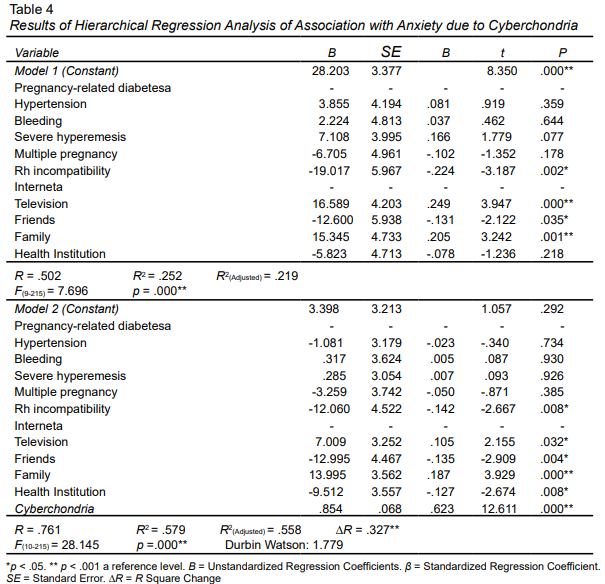 The results of the hierarchical regression analysis examining the association role of cyberchondria in anxiety are given in Table 4. In the model, demographic variables showing significant differences in anxiety levels (Health Problems Experienced During Pregnancy, Sources of Information on High-Risk Pregnancy) were included as control variables. In the first step, these control variables were entered into the model (Model 1). The control variables accounted for 21.9% of the variance in the dependent variable (anxiety) (R2(Adjusted) = .219; F(9, 215) = 7.696; p < .001). Blood incompatibility (β = –.224, p < .05), television (β = .249, p < .001), and family (β = .205, p < .001) were identified as having a significant association with anxiety.