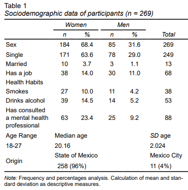 A total of 68.4% of the 269 students were female, and aged 18 to 27. Approximately 96% lived in Edomex and 92.4% were single. Twenty-five per cent of students worked, with a higher proportion of women (14%). In other words, they combined studying and working, compared to 11% of men. Fourteen per cent of students reported that they smoked and 19.7% drank alcohol, including more women (14.5%) than men (5.2%). With respect to their health care, 32.7% of participants said they had seen a mental health professional (a psychiatrist or a psychologist) in the past 12 months, with a higher proportion of women using these services (Table 1).