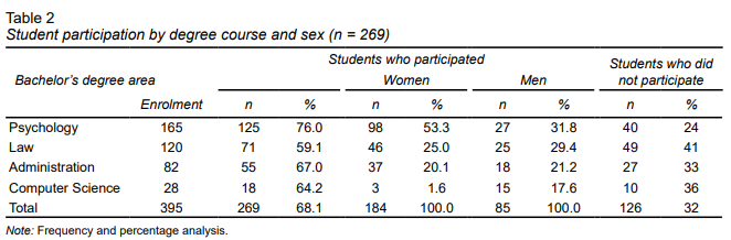 The participation of students by degree course and gender is given in Table 2. The largest number of participants was pursuing a bachelor’s degree in psychology (46.5%). Women comprised 68.4% of participants, with men accounting for 31.6%.