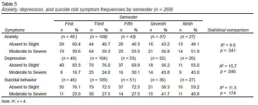 The chi-square test failed to identify a significant association between the semester in which students were enrolled and the symptoms evaluated across all areas of knowledge. However, the proportion of students with moderate to severe symptoms increased after the first semester. The same was also true of anxiety, depression, and suicidal behavior. In the case of anxiety, prevalence increased from 40% in the first semester to approximately 60% in subsequent semesters. The proportion of depression and suicidal behavior increased with every semester (Table 5).