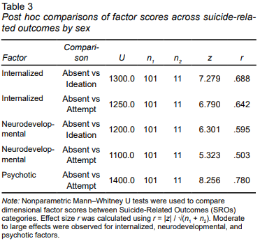 The post-hoc factor analysis revealed significant differences in the influence of the internalized dimension between the (non-SRO) and (attempt-SRO) groups. The neurodevelopmental dimension also showed significant differences between non-SRO and both ideation/attempt-SRO. Detailed results are given in Table 3.