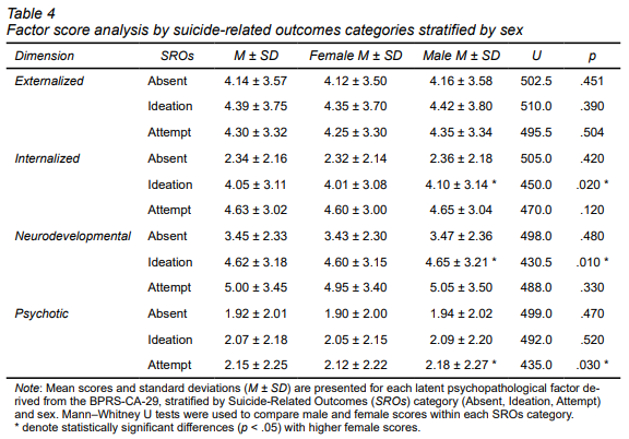 Results. Males exhibited significantly more (ideation/attempt)-SROs than females (n = 143, 58 [40.56 %] vs. n = 158, 52 [32.91 %], U = 7585.5, p = .0135). In (ideation)-SROs, males had higher total psychopathology scores, while females scored significantly higher in internalized and neurodevelopmental factors. In (attempt)-SROs, females showed higher scores in psychotic factors.
