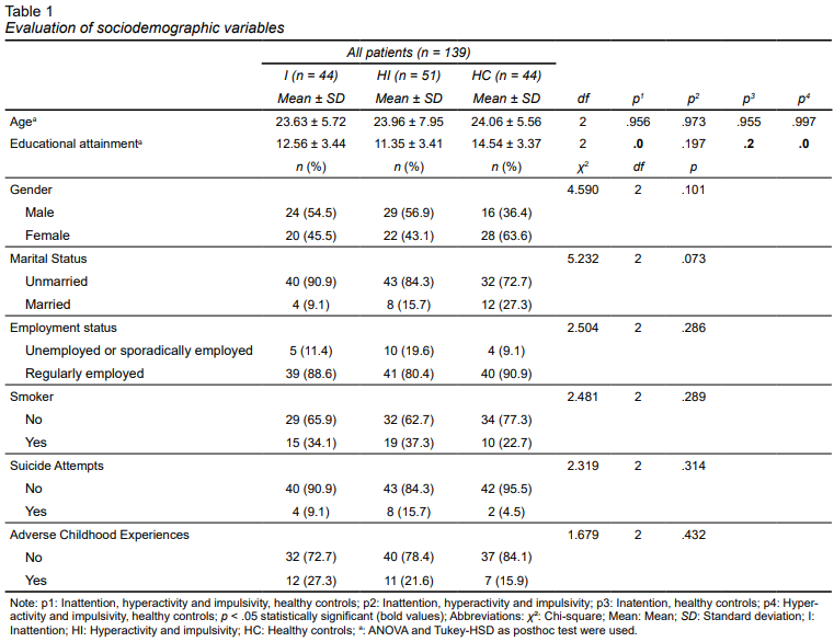 A comparison of the sociodemographic data of patients between groups is shown in Table 1. According to the sub-diagnosis of ADHD, forty-four patients were in the inattention group (I), fifty-one were in the hyperactivity and impulsivity (HI) group, and forty-four were in the healthy control (HC) group. Among the study participants, the mean age of the inattention group was 23.63 ± 5.72, the mean age of the hyperactivity and impulsivity group was 23.96 ± 7.95, and the mean age of the healthy control group was 24.06 ± 5.56, with no statistically significant difference being found. (p > .05). Educational achievement was significantly lower in the inattention, hyperactivity, and impulsivity groups than in the healthy control group (p = 0). There was no statistically significant difference between groups in terms of gender (χ2 = 4.590, p = .101). The normality of the data was assessed using the Kolmogorov-Smirnov test. The results showed that total ADHD (p = .210), narcissism (p = .230), and empathy scores (p = .059) did not deviate significantly from normality.