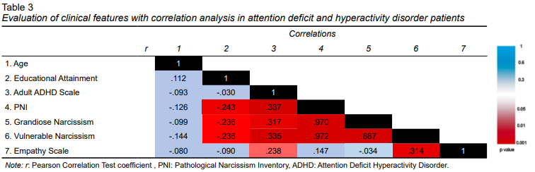 The relationship between the sociodemographic and clinical characteristics of participants is shown in the correlation chart in Table 3. There is a negative correlation between educational attainment and PNI score (r = -.243, p < .01), narcissistic grandiosity score (r = -.236, p < .01), and Narcissistic vulnerability score (r = -.236, p < .01). The Adult ADHD Scale score was positively correlated with the PNI score (r = .337, p < .01), Narcissistic grandiosity score (r = .317, p < .01), Narcissistic vulnerability score (r = .335, p < .01), and Empathy Scale score (r = .238, p < .05). There is a positive correlation between the Narcissistic grandiosity score and the Narcissistic vulnerability score (r = .887, p < .01) and between the narcissistic vulnerability score and the Empathy Scale score (r = .314, p < .01).