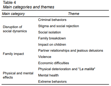 The interpretation of results was based on Husserl’s phenomenological perspective, which seeks to understand lived experiences from the point of view of participants. Interview testimonials revealed diverse perspectives on the consequences of crystal meth use in the lives of users and their relationships. The results presented here derive from the IPA conducted following the steps outlined by Smith et al. (2009), ensuring rigorous interpretation of participants’ narratives. The analysis was organized into three main categories: disruption of social dynamics, family impact, and physical and mental health effects. Table 4 shows the main categories and themes.